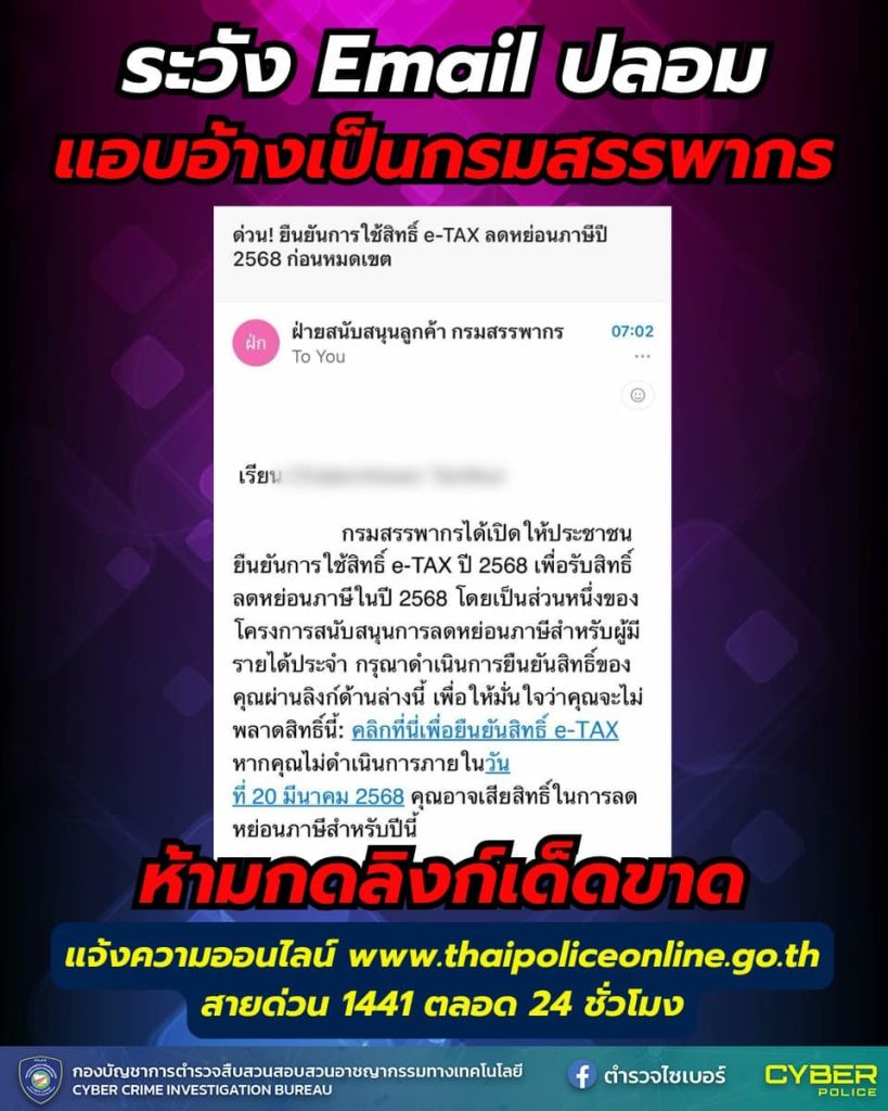 ขอให้ทุกท่านระมัดระวัง! ช่วงนี้มีมิจฉาชีพที่ส่งอีเมลแอบอ้างเป็นสรรพากรเพื่อหลอกลวงผู้คน โดยจะแจ้งว่ามีโครงการลดหย่อนภาษี ให้ยืนยันสิทธิ์โดยกรอก username และ password เพื่อเข้าสู่ระบบ หรือกรอกข้อมูลส่วนตัวเพื่อล้วงข้อมูลสำคัญ
