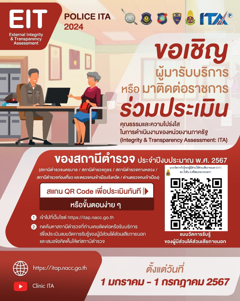 การประชาสัมพันธ์ข้อมูลการประเมินคุรธรรมและความโปร่งใสในการดำเนินงานของหน่วยงาน ภาครัฐ (Integrity and Transparency Assessment : ITA ) ของสถานีตำรวจ ประจำปีงบประมาณ พ.ศ.2567